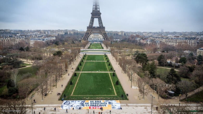 Pour les 10 ans de l’Accord de Paris, les activistes de Greenpeace ont déposé une banderole devant la Tour Eiffel pour dénoncer 10 ans de sabotage climatique orchestré par les responsables politiques, les ultra-riches, les grosses entreprises polluantes et les forces réactionnaires. © Greenpeace