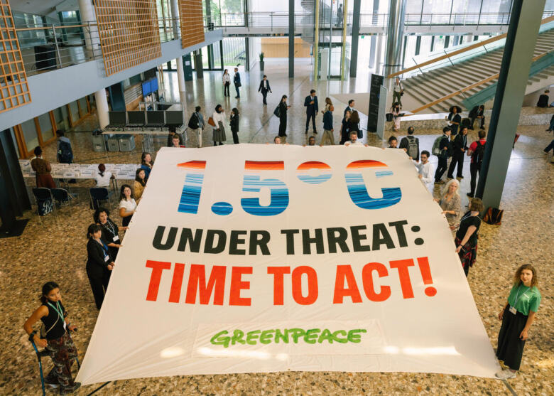 Des militant·es déploient une banderole à l’intérieur du bâtiment des Nations unies lors de la Conférence sur le climat de Bonn, appelant à des mesures plus fortes pour respecter la limite de 1,5°C. © Marie Jacquemin / Greenpeace