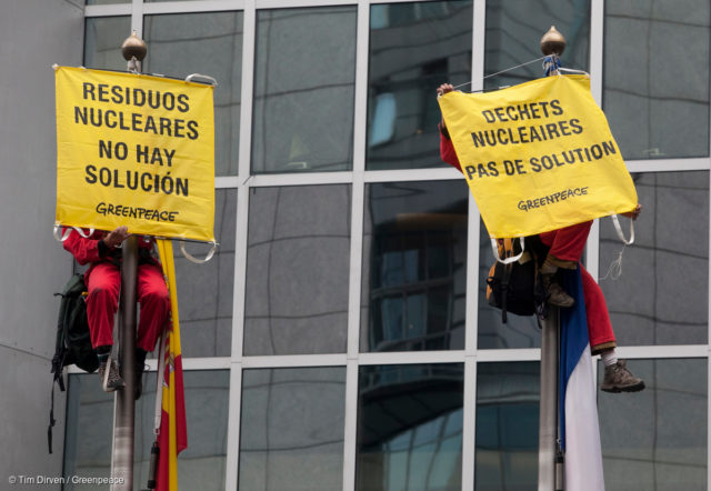 Des grimpeurs de Greenpeace escaladent le bâtiment du Parlement de l’Union européenne et déploient en plusieurs langues des banderoles rappelant que le nucléaire produit des déchets radioactifs… et que nous ne savons toujours pas quoi en faire. (2010)