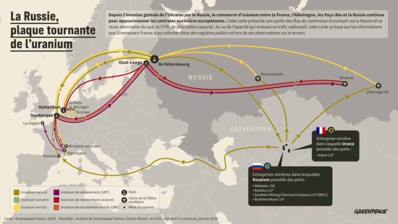 Greenpeace France a croisé les mouvements des cargaisons d’uranium dans le port de Dunkerque avec des données des importations et exportations d’uranium extraites des douanes. L’ONG a également enquêté sur l’armateur des cargos et sur l’implication de l’entreprise Rosatom dans les mines du Kazakhstan. Toutes ces informations montrent que la place de la Russie est toujours centrale pour les affaires d’EDF, d’Orano et de Framatome.