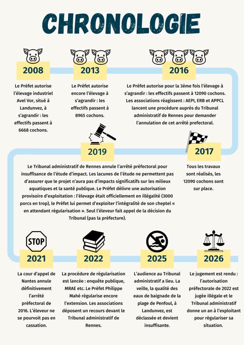 Après deux extensions en 2008 et 2013, l’élevage Avel Vor, dirigé par Philippe Bizien, est devenu un élevage industriel de taille moyenne. En 2016, une nouvelle autorisation d’extension est accordée par le préfet, portant les effectifs de l’exploitation à plus de 12 000 porcs. Contestée par le collectif “Stoppons l’extension” devant le tribunal administratif, cette autorisation est annulée en 2019, avant d’être ré-autorisée temporairement par le préfet, dans l’attente d’une régularisation. L’annulation est finalement confirmée en appel en 2021. Toutefois, l’extension est de nouveau autorisée par la préfecture en 2022, celle-ci estimant que les vices ayant conduit à l’annulation de l’autorisation ont effectivement été régularisés.