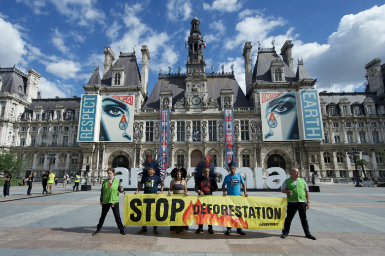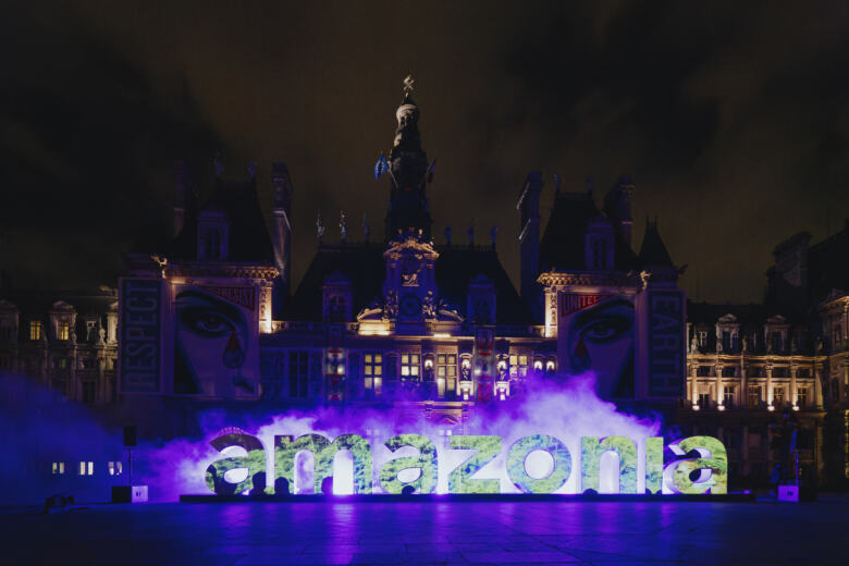 Greenpeace France, accompagnée de cinq représentantes et représentants de peuples autochtones du Brésil, dépose des lettres géantes AMAZONIA sur le parvis de l’Hôtel de ville de Paris afin de sensibiliser le public à la déforestation qui menace l’Amazonie.