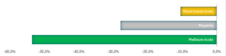 Analyse graphique par Greenpeace montrant le gain obtenu en matière de consommation énergétique primaire par rapport au seuil réglementaire sur l’ensemble des bâtiments du parc scolaire de la vague 1 du plan soumis à la RT2012 (production photovoltaïque exclue).